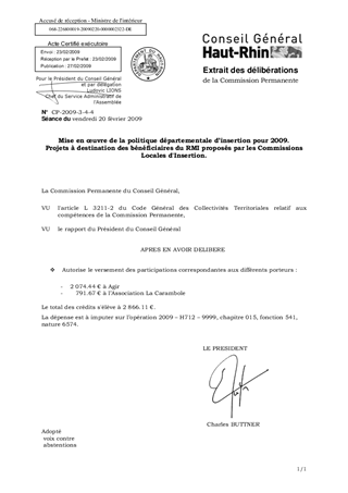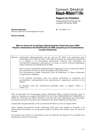 L’Assemblée Départementale, lors du vote du BP 2009, s’est prononcée pour l’inscription d’un crédit de 5 823 135 € afin de soutenir les organismes d’insertion et a délégué à la Commission Permanente l’examen des demandes de contributions financières nécessaires à la mise en œuvre d’actions spécifiques visant l’insertion des bénéficiaires du RMI. Dans ce cadre l’Assemblée Départementale a également voté un crédit de 65 000 € pour permettre la mise en œuvre de projets locaux d’insertion. Les Commissions Locales d’Insertion (CLI) de Mulhouse, et Thann présentent 2 projets pour validation. Il est proposé d'autoriser, pour les actions présentées, le versement des participations correspondantes aux associations et organismes porteurs de ces projets. Le montant total des subventions proposées dans ce rapport s’élève à : 2 866.11 €.