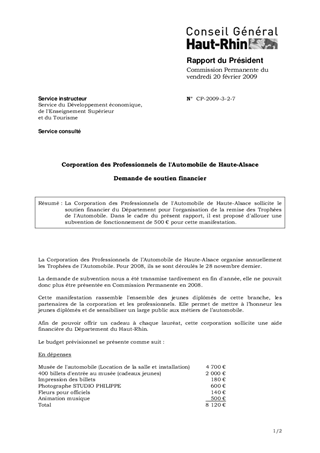 Corporation des Professionnels de l'Automobile de Haute-Alsace Demande de soutien financier
