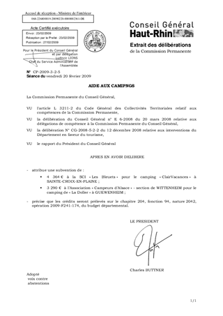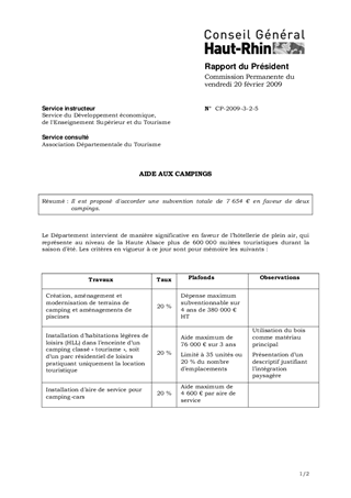 AIDE AUX CAMPINGS Resumé Il est proposé d'accorder une subvention totale de 7 654 € en faveur de deux campings. Pièces jointes DELIBERATION RAPPORT Assemblée : Commission Permanente Date : 20/02/2009 Rapporteur : Non défini Collectivité : Conseil départemental du Haut-Rhin Direction : Non défini Service : Service Développement Economique Domaine : Tourisme Commission : Commission Permanente