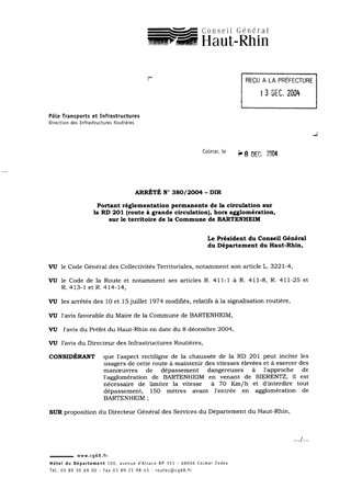 portant réglementation permanente de la circulation sur la RD 201 (route à grande circulation), hors agglomération, sur le territoire de la commune de Bartenheim. Resumé Pièces jointes ARRETE Assemblée : Non défini Date : 08/12/2004 Rapporteur : Non défini Collectivité : Conseil départemental du Haut-Rhin Direction : Non défini Service : Direction des Routes Domaine : Circulation Commission :