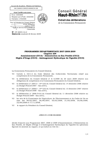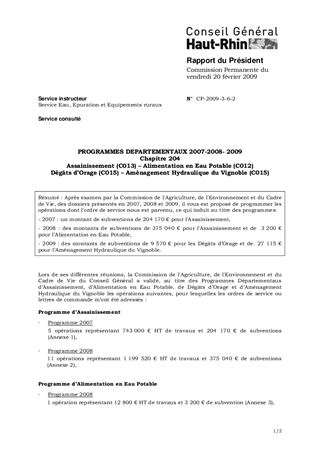PROGRAMMES DEPARTEMENTAUX 2007-2008-2009 Chapitre 204 Assainissement (C013) - Alimentation en Eau potable (C012) - Dégâts d'Orage (C015) Aménagement Hydraulique du Vignoble (C015)