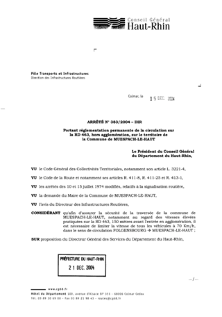 portant réglementation permanente de la circulation sur le RD 463, hors agglomération, sur le territoire de la commune de Muespach le Haut. Resumé Pièces jointes ARRETE Assemblée : Non défini Date : 15/12/2004 Rapporteur : Non défini Collectivité : Conseil départemental du Haut-Rhin Direction : Non défini Service : Direction des Routes Domaine : Circulation Commission :