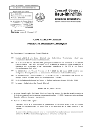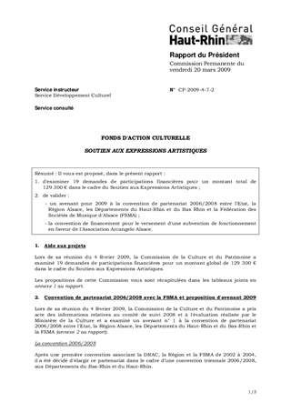 Il vous est proposé, dans le présent rapport : 1. d'examiner 19 demandes de participations financières pour un montant total de 129 300 € dans le cadre du Soutien aux Expressions Artistiques ; 2. de valider :  un avenant pour 2009 à la convention de partenariat 2006/2008 entre l'Etat, la Région Alsace, les Départements du Haut-Rhin et du Bas Rhin et la Fédération des Sociétés de Musique d'Alsace (FSMA) ;  la convention de financement pour le versement d'une subvention de fonctionnement en faveur de l'association Arcangelo Alsace.