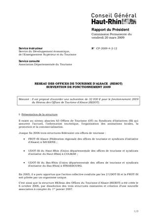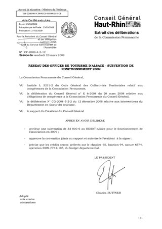 RESEAU DES OFFICES DE TOURISME D'ALSACE - SUBVENTION DE FONCTIONNEMENT 2009
