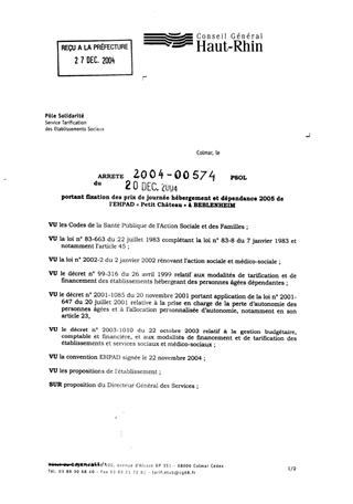 portant fixation des prix de journée hébergement et dépendance 2005 de l'EHPAD "Petit Château" à Beblenheim. Resumé Pièces jointes ARRETE Assemblée : Non défini Date : 20/12/2004 Rapporteur : Non défini Collectivité : Conseil départemental du Haut-Rhin Direction : Non défini Service : Service de la Tarification des Etablissements Domaine : Prix de Journée Commission :