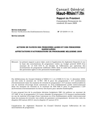 Le présent rapport a pour objet, suite à l’application du règlement financier et sur la base des autorisations de programme votées au budget primitif 2009 d’un montant de 13 818 070 €, de décider de l’affectation par opération des autorisations de programme millésime 2009, dans le cadre des actions en faveur des personnes âgées et des personnes handicapées.