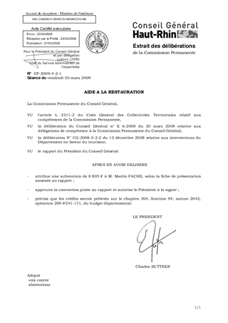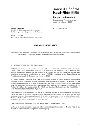 AIDE A LA RESTAURATION Resumé Il est proposé d'accorder une subvention de 8 805 € en faveur d'un restaurant qui réalise des travaux. Pièces jointes DELIBERATION RAPPORT Assemblée : Commission Permanente Date : 20/03/2009 Rapporteur : Non défini Collectivité : Conseil départemental du Haut-Rhin Direction : Non défini Service : Service Développement Economique Domaine : Tourisme Commission : Commission Permanente