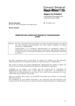 Les deux communes dont la liste figure en annexe au présent rapport ont sollicité une aide financière départementale pour leurs projets d’insertion de lignes électriques et téléphoniques. Conformément à la convention départementale de partenariat, signée le 20 décembre 2007 entre le Département du Haut-Rhin, EDF Distribution Alsace et France Télécom, le total des subventions de la part du Département s’élèverait à 22.304 €.