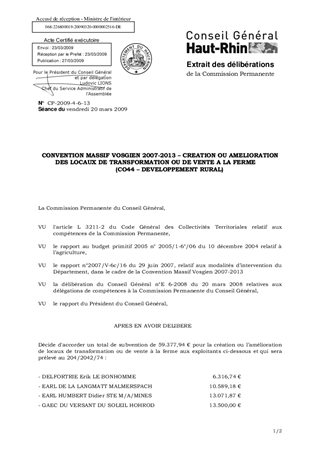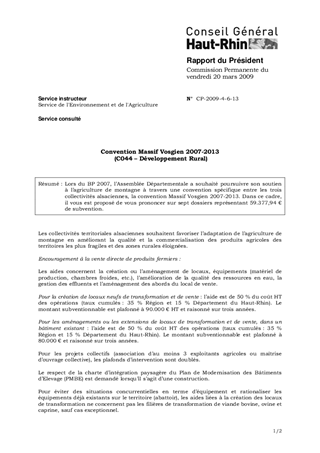Lors du BP 2007, l’Assemblée Départementale a souhaité poursuivre son soutien à l’agriculture de montagne à travers une convention spécifique entre les trois collectivités alsaciennes, la convention Massif Vosgien 2007-2013. Dans ce cadre, il vous est proposé de vous prononcer sur sept dossiers représentant 59.377,94 € de subvention.