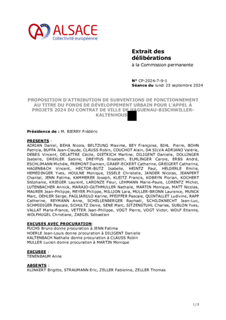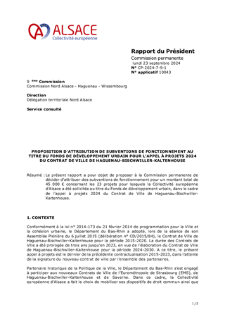 Le présent rapport a pour objet de proposer à la Commission permanente de décider d’attribuer des subventions de fonctionnement pour un montant total de 45 000 € concernant les 23 projets pour lesquels la Collectivité européenne d'Alsace a été sollicitée au titre du Fonds de développement urbain, dans le cadre de l'appel à projets 2024 du Contrat de Ville de Haguenau-Bischwiller-Kaltenhouse.