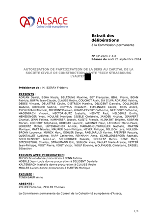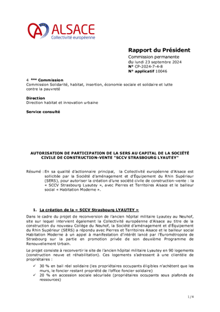 En sa qualité d’actionnaire principal, la Collectivité européenne d’Alsace est sollicitée par la Société d'aménagement et d'Équipement du Rhin Supérieur (SERS), pour autoriser la création d’une société civile de construction-vente : la « SCCV Strasbourg Lyautey », avec Pierres et Territoires Alsace et le bailleur social « Habitation Moderne ».