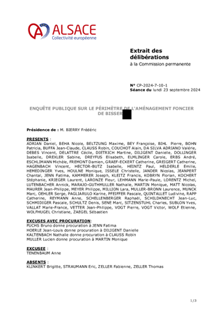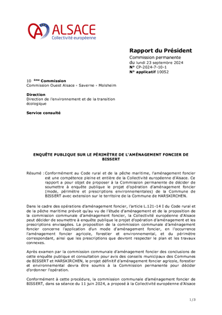 Conformément au Code rural et de la pêche maritime, l’aménagement foncier est une compétence pleine et entière de la Collectivité européenne d’Alsace. Ce rapport a pour objet de proposer à la Commission permanente de décider de soumettre à enquête publique le projet d'opération d’aménagement foncier (mode, périmètre et prescriptions environnementales) de la Commune de BISSERT avec extension sur le territoire de la Commune de HARSKIRCHEN.