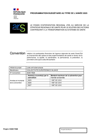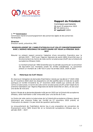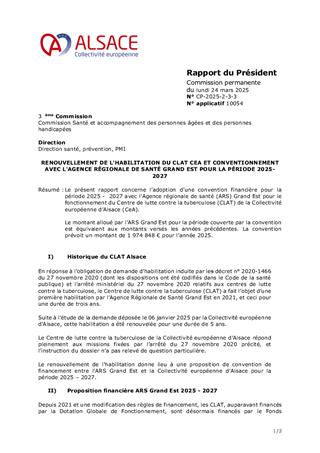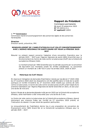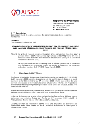 Le présent rapport concerne l’adoption d’une convention financière pour la période 2025 - 2027 avec l’Agence régionale de santé (ARS) Grand Est pour le fonctionnement du Centre de lutte contre la tuberculose (CLAT) de la Collectivité européenne d’Alsace (CeA). Le montant alloué par l’ARS Grand Est pour la période couverte par la convention est équivalent aux montants versés les années précédentes. La convention prévoit un montant de 1 867 021 € pour les années 2025, 2026 et 2027.