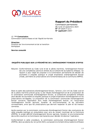 Conformément au Code rural et de la pêche maritime, l’aménagement foncier est une compétence pleine et entière de la Collectivité européenne d’Alsace. Ce rapport a pour objet de proposer à la Commission permanente de décider de soumettre à enquête publique le projet d'opération d’aménagement foncier (mode, périmètre et prescriptions environnementales) de la Commune d’EPFIG.