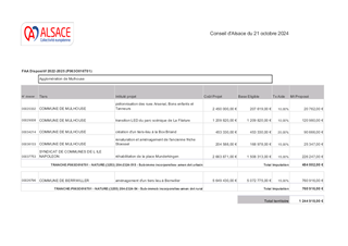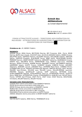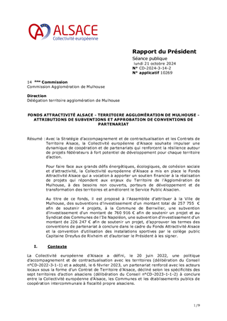 Avec la Stratégie d’accompagnement et de contractualisation et les Contrats de Territoire Alsace, la Collectivité européenne d’Alsace souhaite impulser une dynamique de coopération et de partenariats qui renforcent la résilience autour de projets fédérateurs à fort potentiel de développement pour chaque territoire d’action. Pour faire face aux grands défis énergétiques, écologiques, de cohésion sociale et d’attractivité, la Collectivité européenne d’Alsace a mis en place le Fonds Attractivité Alsace qui a vocation à apporter un soutien financier à la réalisation de projets qui répondent aux enjeux du Territoire de l’Agglomération de Mulhouse, à des besoins non couverts, porteurs de développement et de transformation des territoires et améliorent le Service Public Alsacien. Au titre de ce fonds, il est proposé à l’Assemblée d’attribuer à la Ville de Mulhouse, des subventions d'investissement d'un montant total de 257 755 € afin de soutenir 4 projets, à la Commune de Berrwiller, une subvention d'investissement d'un montant de 760 916 € afin de soutenir un projet et au Syndicat des Communes de l'Ile Napoléon, une subvention d'investissement d'un montant de 226 247 € afin de soutenir un projet, d’approuver les termes des conventions de partenariat à conclure dans le cadre du Fonds Attractivité Alsace et la convention d'utilisation des installations sportives par le collège public Capitaine Dreyfus de Rixheim et d’autoriser le Président à les signer.