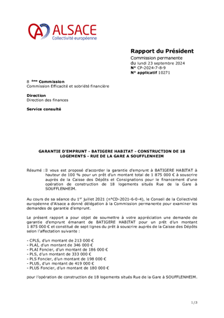 Il vous est proposé d’accorder la garantie d'emprunt à BATIGERE HABITAT à hauteur de 100 % pour un prêt d’un montant total de 1 875 000 € à souscrire auprès de la Caisse des Dépôts et Consignations pour le financement d'une opération de construction de 18 logements situés Rue de la Gare à SOUFFLENHEIM.