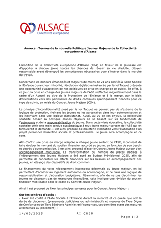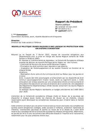La loi Taquet du 7 février 2022, impose de nouvelles obligations aux Départements pour la prise en charge des Jeunes Majeurs sortants de l’Aide Sociale à l’Enfance (ASE). En réponse à l’intentionnalité du législateur, la Collectivité Européenne d’Alsace propose de décliner sa nouvelle Politique jeune majeur sur ses 4 piliers: - Continuité de Parcours du jeune confié devenant majeur, - Priorisation du droit commun pour répondre à ses besoins, - Graduation de l’Accompagnement et du soutien financier en fonction de la singularité des situations, - Mobilisation d’une veille et d’un principe de droit au Retour pour les jeunes en errance Ainsi, le jeune doit être accompagné prioritairement par les dispositifs de droit commun (accompagnement mission locale, accès au logement social…). Cette articulation est rendue possible par une collaboration étroite en transversalité et articulation fine des divers services et directions de la collectivité. Une adaptation des Règlements Départementaux d’Aide Sociale concernant les Jeunes Majeurs est nécessaire. La politique Jeunes Majeurs représente un budget prévisionnel de 5 805 000 € pour 2025.