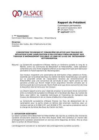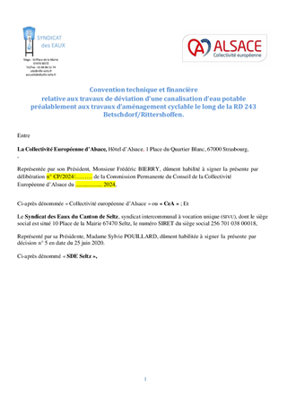 La Collectivité européenne d'Alsace réalise un itinéraire cyclable le long de la RD243, entre les communes de Betschdorf et Rittershoffen. Cette opération comprend une voie mixte longeant la RD et un ouvrage d’art type pont dalle pour permettre le franchissement de l’Eschengraben. Ces travaux impactent une canalisation de distribution d’eau potable en fonte, exploitée par le Syndicat des Eaux du Canton de Seltz implantée pour une partie sur la propriété privée de l’association foncière de remembrement de Rittershoffen avec une convention de servitude et pour l’autre partie sur des parcelles privées qui feront l’objet d’une acquisition foncière amiable par la Communauté de Communes de l’Outre Forêt ainsi que d’une convention de mise à disposition des terrains pour les travaux. Le présent rapport a ainsi pour objet de proposer la conclusion d’une convention entre la Collectivité européenne d’Alsace et le Syndicat des Eaux du Canton de Seltz, pour définir les modalités techniques et financières de réalisation des travaux de déplacement de ce réseau d’adduction d’eau potable. La Collectivité européenne d'Alsace finance les frais de déplacement de la canalisation pour la partie située en dehors des emprises routières, pour un montant estimé à 24 000 € HT, soit 28 800 € TTC. Les autres prestations sont à la charge du Syndicat des Eaux du Canton de Seltz.