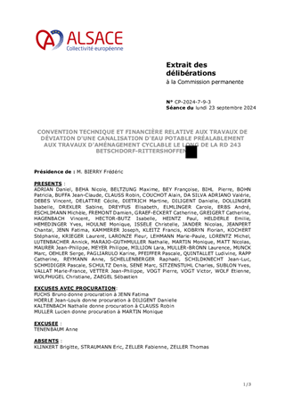 CONVENTION TECHNIQUE ET FINANCIÈRE RELATIVE AUX TRAVAUX DE DÉVIATION D'UNE CANALISATION D'EAU POTABLE PRÉALABLEMENT AUX TRAVAUX D'AMÉNAGEMENT CYCLABLE LE LONG DE LA RD 243BETSCHDORF-RITTERSHOFFEN.