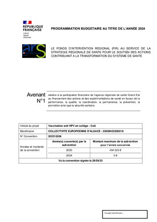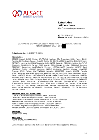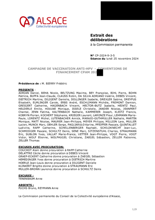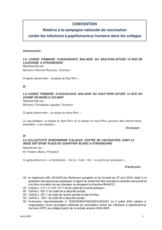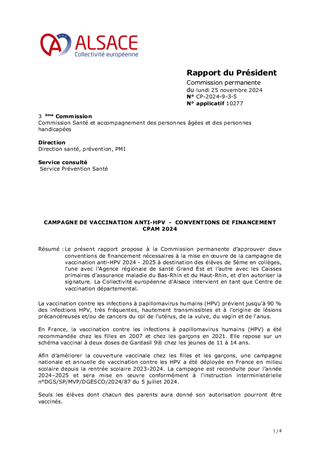Le présent rapport propose à la Commission permanente d’approuver deux conventions de financement nécessaires à la mise en œuvre de la campagne de vaccination anti-HPV 2024 - 2025 à destination des élèves de 5ème en collèges, l’une avec l’Agence régionale de santé Grand Est et l’autre avec les Caisses primaires d’assurance maladie du Bas-Rhin et du Haut-Rhin, et d’en autoriser la signature. La Collectivité européenne d’Alsace intervient en tant que Centre de vaccination départemental.