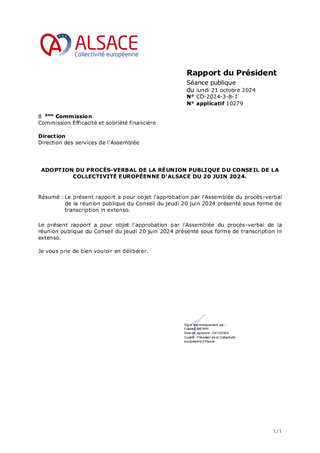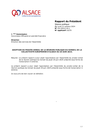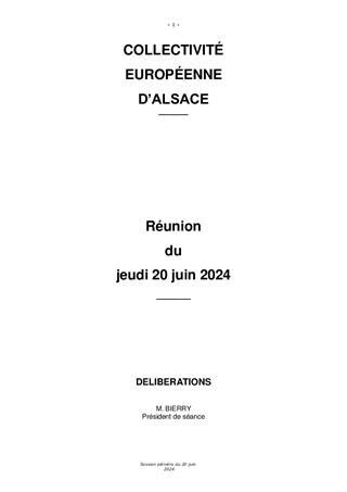 ADOPTION DU PROCÈS-VERBAL DE LA RÉUNION PUBLIQUE DU CONSEIL DE LA COLLECTIVITÉ EUROPÉENNE D'ALSACE DU 20 JUIN 2024.