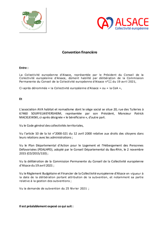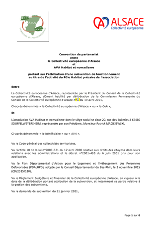 Le présent rapport a pour objet de proposer à la Commission permanente de décider l'attribution de deux subventions à l'association AVA Habitat et nomadisme pour : le fonctionnement de son pôle Habitat précaire et le soutien à une opération d'amélioration des conditions de vie d'un ménage très défavorisé à Herrlisheim.