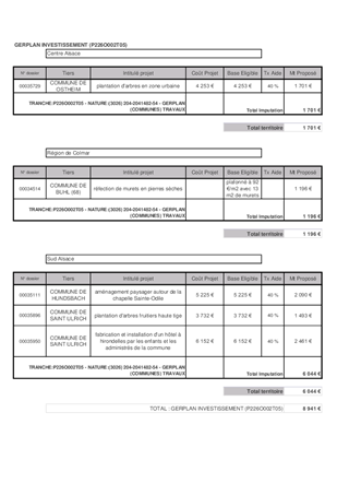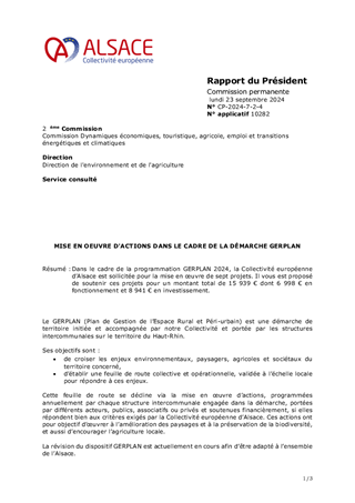 Dans le cadre de la programmation GERPLAN 2024, la Collectivité européenne d’Alsace est sollicitée pour la mise en œuvre de sept projets. Il vous est proposé de soutenir ces projets pour un montant total de 15 939 € dont 6 998 € en fonctionnement et 8 941 € en investissement.