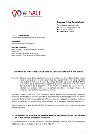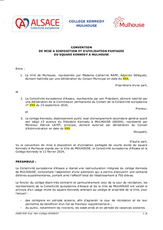 Dans le cadre de la régularisation des propriétés foncières des collèges publics Alsaciens, le présent rapport a pour objet de proposer le transfert de propriété à titre gratuit de l’emprise foncière du collège Kennedy, par la Ville de MULHOUSE, au bénéfice de la Collectivité européenne d’Alsace, l’adoption de la convention définitive de mise à disposition et d’utilisation partagée du square Kennedy attenant au collège, ainsi que la constitution d’une servitude d’accès des pompiers au profit d’une parcelle du collège.