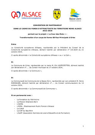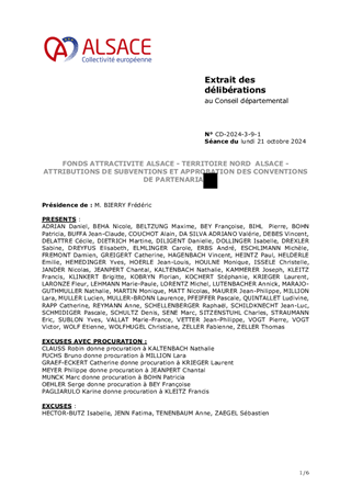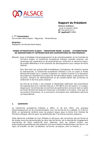 Avec la Stratégie d’accompagnement et de contractualisation et les Contrats de Territoire Alsace, la Collectivité européenne d'Alsace souhaite impulser une dynamique de coopération et de partenariats qui renforcent la résilience autour de projets fédérateurs à fort potentiel de développement pour chaque territoire d’action. Pour faire face aux grands défis énergétiques, écologiques, de cohésion sociale et d’attractivité, la Collectivité européenne d'Alsace a mis en place le Fonds Attractivité Alsace qui a vocation à apporter un soutien financier à la réalisation de projets qui répondent aux enjeux du Territoire Nord Alsace, à des besoins non couverts, porteurs de développement et de transformation des territoires et améliorent le Service public alsacien. Au titre de ce fonds, il est proposé à l’Assemblée d’attribuer des subventions d’investissement d’un montant total de 2 197 885 € afin de soutenir 11 projets, d’approuver les termes des conventions de partenariat à conclure dans le cadre du Fonds Attractivité Alsace et d’autoriser le Président à les signer, ainsi que les conventions financières, et la convention d'utilisation des installations sportives correspondantes.