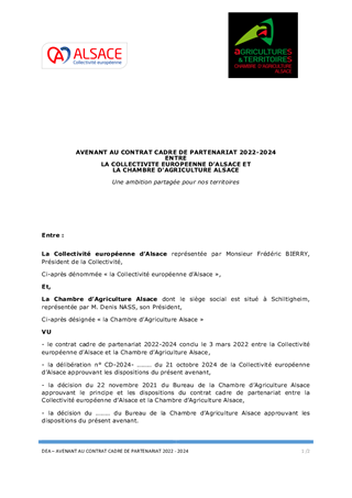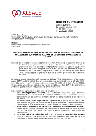 Le contrat pluriannuel de partenariat entre la Collectivité européenne d'Alsace et la Chambre d'Agriculture Alsace actuel se termine en 2024 et les élections professionnelles des Chambres d'Agriculture ont lieu en janvier 2025. Pour permettre un travail conjoint sur le futur contrat de partenariat avec la mandature de la Chambre d'Agriculture Alsace qui se mettra en place début 2025, il est proposé de prolonger d'un an le contrat pluriannuel de partenariat en cours.