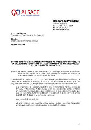 Le présent rapport a pour objet de rendre compte des délégations accordées au Président du Conseil de la Collectivité européenne d’Alsace en matière de marchés publics du 1er janvier au 30 juin 2024.