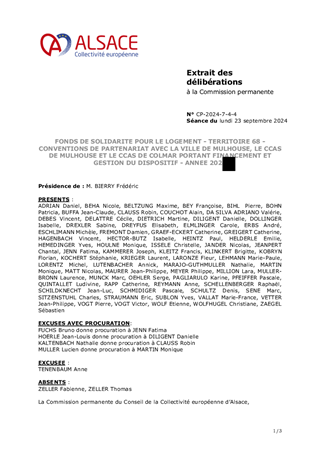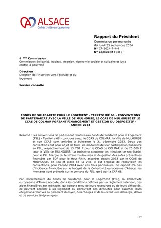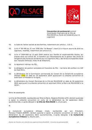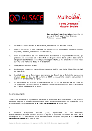 Les conventions de partenariat relatives au Fonds de Solidarité pour le Logement (FSL) - Territoire 68 - conclues avec le CCAS de COLMAR, la Ville de MULHOUSE et son CCAS sont arrivées à échéance le 31 décembre 2023. Deux des conventions ont pour objet de fixer les modalités de leur participation financière au FSL, respectivement de 13 750 € pour le CCAS de COLMAR et de 20 000 € pour la Ville de MULHOUSE. La troisième concerne les missions de secrétariat pour le FSL Energie du territoire mulhousien et de gestion des aides préventives financées par EDF pour le Haut-Rhin, assurées depuis 2023 par le CCAS de MULHOUSE, en lieu et place de la Ville. Il est proposé de renouveler les conventions, pour l'année 2024 avec ces trois partenaires. Ce rapport n'a pas d'incidence financière sur le budget de la Collectivité européenne d'Alsace, les montants sont prélevés sur le compte du FSL, géré par la CAF 68.