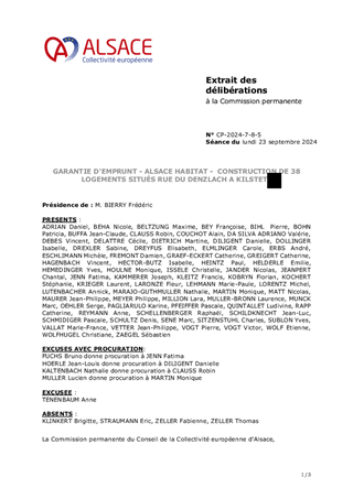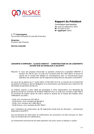 Il vous est proposé d’accorder la garantie d'emprunt à ALSACE HABITAT à hauteur de 100 % pour un prêt d’un montant total de 3 807 000 € à souscrire auprès de la Caisse des Dépôts et Consignations pour le financement d'une opération de construction de 38 logements situés Rue du Denzlach à KILSTETT.
