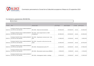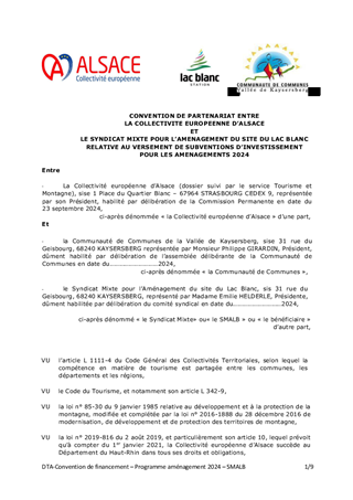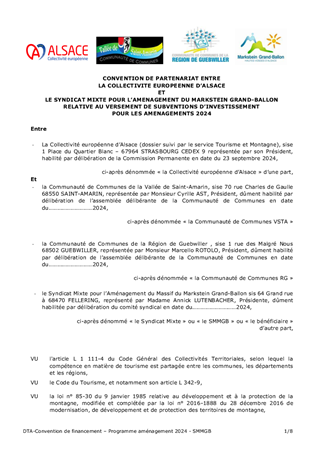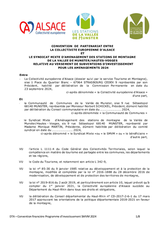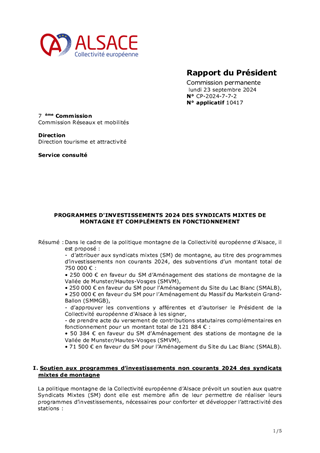 Dans le cadre de la politique montagne de la Collectivité européenne d'Alsace, il est proposé : - d'attribuer aux syndicats mixtes (SM) de montagne, au titre des programmes d’investissements non courants 2024, des subventions d’un montant total de 750 000 € : • 250 000 € en faveur du SM d’Aménagement des stations de montagne de la Vallée de Munster/Hautes-Vosges (SMVM), • 250 000 € en faveur du SM pour l’Aménagement du Site du Lac Blanc (SMALB), • 250 000 € en faveur du SM pour l’Aménagement du Massif du Markstein Grand-Ballon (SMMGB), - d’approuver les conventions y afférentes et d’autoriser le Président de la Collectivité européenne d'Alsace à les signer, - de prendre acte du versement de contributions statutaires complémentaires en fonctionnement pour un montant total de 121 884 € : • 50 384 € en faveur du SM d’Aménagement des stations de montagne de la Vallée de Munster/Hautes-Vosges (SMVM), • 71 500 € en faveur du SM pour l’Aménagement du Site du Lac Blanc (SMALB).
