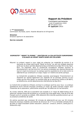 Le présent rapport a pour objet de présenter les modalités de soutien à la poursuite du projet sport-santé "Boost ta forme" au sein de collèges alsaciens porté par les deux comités départementaux d'athlétisme du Bas-Rhin et du Haut-Rhin. Ce dispositif, dont la Collectivité européenne d'Alsace soutient le développement, permet d'enrichir les actions proposées aux équipes éducatives tout en visant à promouvoir la pratique sportive quotidienne et la lutte contre la sédentarité qui constituent un enjeu majeur en matière de santé publique. La Collectivité européenne d'Alsace souhaite accompagner financièrement ce dispositif qui répond également aux objectifs de sa politique sportive et aux enjeux de son Plan Santé. Le montant total de la subvention s'élève à 28 000 €, au bénéfice du comité départemental d'athlétisme du Bas-Rhin.