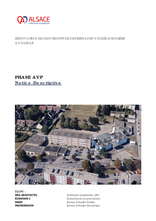 La Collectivité européenne d’Alsace s’est engagée au travers d’un plan d’investissement ambitieux, à améliorer les performances thermiques de son parc immobilier. Elle souhaite également offrir aux collégiens alsaciens des conditions d’apprentissage optimales. Dans ce contexte, il vous est proposé aujourd’hui d’approuver l’Avant-Projet Définitif de l’opération de réfection de l’enveloppe du bâtiment externat du Collège Molière à Colmar, établi par le cabinet d’architecture MSA Architectes de Colmar, qui répond à ces deux objectifs. Le montant prévisionnel global de cette opération est fixé à 2 900 000 €TTC, valeur avril 2024.