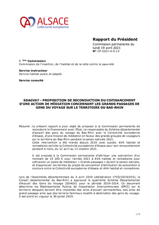 SDAGV67 - PROPOSITION DE RECONDUCTION DU COFINANCEMENT D'UNE ACTION DE MÉDIATION CONCERNANT LES GRANDS PASSAGES DE GENS DU VOYAGE SUR LE TERRITOIRE DU BAS-RHIN