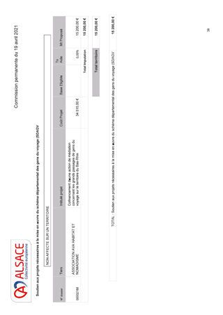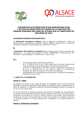 Le présent rapport a pour objet de proposer à la Commission permanente de reconduire le financement avec l’Etat, co-responsable du Schéma départemental d’accueil des gens du voyage du Bas-Rhin avec la Collectivité européenne d’Alsace, d’une mission de médiation en faveur des grands groupes de voyageurs sur le territoire du Bas-Rhin pendant la saison estivale 2021. Cette intervention a été menée depuis 2010 avec succès. AVA habitat et nomadisme sollicite la Collectivité européenne d’Alsace pour son renouvellement pendant 6 mois, du 12 avril au 12 octobre 2021. Il est proposé à la Commission permanente d’attribuer une subvention d’un montant de 15 200 € pour l’année 2021 à AVA habitat et nomadisme pour cofinancer un poste de médiateur « Grands passages » durant la saison estivale, et d’approuver les termes du projet de convention d’attribution de subvention à conclure entre la Collectivité européenne d’Alsace et AVA habitat et nomadisme.
