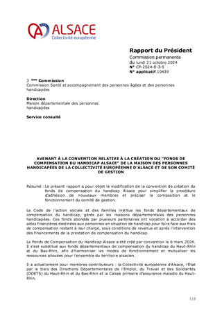 Le présent rapport a pour objet la modification de la convention de création du fonds de compensation du handicap Alsace pour simplifier la procédure d'adhésion de nouveaux membres et préciser la composition et le fonctionnement du comité de gestion.