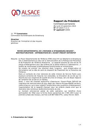 Le Foyer Départemental de l’Enfance (FDE) situé 44 rue Stéphanie à Strasbourg est un établissement au cœur de la restructuration de la Politique de Prévention et de Protection de l’Enfance Alsacienne. La capacité actuelle du site est de 75 places d’hébergement pour des enfants de la petite enfance à l’adolescence ; il souffre de nombreuses problématiques fonctionnelles et immobilières. Sa mission de premier lieu d’accueil dans l’urgence, puis d’observation et d’orientation est la tête de pont du dispositif de Placement de la Protection de l’Enfance. Dans un contexte de crise nationale de cette mission de Service Public avec plusieurs centaines de mesures non exécutées, la rénovation de ce site qui ne répond plus aux exigences de qualité de prise en charge, est une étape majeure de l’ambition de la CeA en la matière. Aussi, il vous est proposé aujourd’hui d’approuver l’Avant-Projet Définitif de l’opération de restructuration du site, établi par l’Atelier Philippe MADEC de Paris, maître d’œuvre, qui a pour objectif l’amélioration des conditions d’hébergement, l’augmentation de la capacité d’accueil pour les enfants placés ainsi que la résorption des nombreux dysfonctionnements du site. Le montant prévisionnel global de cette opération, qui bénéficie d’une participation de l’Etat sous la forme d’une subvention de 2 504 284 € pour la première phase des travaux, est fixé à 28 887 000 €TTC, valeur février 2024.