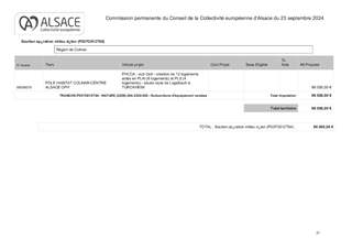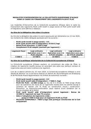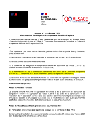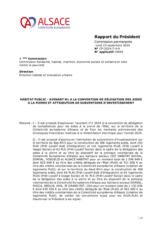 I – Il est proposé d'approuver l'avenant n°1 2024 à la convention de délégation de compétences pour les aides à la pierre de l'Etat, sur le territoire de la Collectivité européenne d'Alsace et de fixer les montants prévisionnels des enveloppes financières relatives à la réhabilitation thermique pour l’année 2024. II - Il est proposé d'approuver l'attribution de subventions d'investissement sur le territoire du Bas-Rhin pour la construction de 306 logements aidés, dont 103 PLAI (Prêt Locatif Aidé d’Intégration) et 141 logements PLUS (Prêt Locatif à Usage Social) et 62 PLS (Prêt Locatif Social) dans le cadre de la délégation des aides à la pierre et au titre du dispositif de la politique volontariste de la Collectivité Européenne d’Alsace aux bailleurs sociaux CDC HABITAT SOCIAL, DOMIAL, VOSGELIS et ALSACE HABITAT pour un montant total de 1 546 648 € dont 825 648 € au titre des crédits délégués de l'Etat (PLAI) et 721 000 € au titre des crédits volontaristes de la Collectivité européenne d'Alsace (création de logements PLAI), et sur le territoire du Haut-Rhin pour la construction de 188 logements aidés, dont 66 PLAI (Prêt Locatif Aidé d’Intégration) et 81 logements PLUS (Prêt Locatif à Usage Social) et 41 PLS (Prêt Locatif Social) dans le cadre de la délégation des aides à la pierre et au titre du dispositif de la politique volontariste de la Collectivité Européenne d’Alsace aux bailleurs sociaux DOMIAL, PHCCA, NEOLIA, HHA, 3F GRAND EST, CAH pour un montant total de 1 132 036 € dont 630 036 € au titre des crédits délégués de l'Etat (PLAI) et 502 000 € au titre des crédits volontaristes de la Collectivité européenne d'Alsace (création de logements PLAI), de valider les conventions types pour les PLUS-PLAI et d'autoriser le Président à les signer.