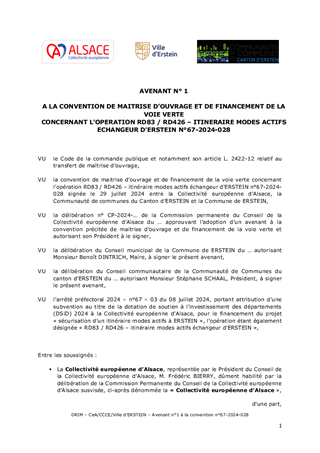Le présent rapport a pour objet d’approuver les termes de l’avenant n°1 à la convention de maitrise d’ouvrage et de financement de la voie verte n°67-2024-028, signée par la Communauté de Communes du Canton d’ERSTEIN, la Commune d’ERSTEIN et la Collectivité européenne d’Alsace, en vue d’intégrer dans le financement de l’opération d’aménagement d’un itinéraire modes actifs, situé au droit de l’échangeur RD83/RD426 et en agglomération d’Erstein, l'attribution d’une subvention au titre de la dotation de soutien à l’investissement des départements (DSiD) 2024. Cette subvention a pour effet de réduire la participation financière de chacune des parties partenaires, portant notamment, celle de la Collectivité européenne d’Alsace, de 3 035 200 € HT à 2 075 200 € HT.