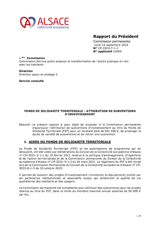 Le présent rapport a pour objet de proposer à la Commission permanente d'approuver l'attribution de subventions d'investissement au titre du Fonds de Solidarité Territoriale (FST) pour un montant total de 601 490 €, de prolonger la durée de validité de subventions et de retirer une subvention.