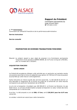 Le présent rapport a pour objet de proposer à la Commission permanente l'acquisition d'une parcelle à SARRE-UNION, de 4,47 ares le long de la RD1061, pour un montant de 2 235,00 €.