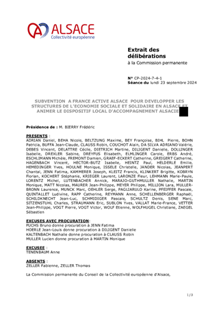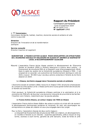 L'association France Active Alsace soutient le développement de l'Economie Sociale et Solidaire (ESS) à l’échelle alsacienne à travers deux actions : le financement de structures ESS et le Dispositif Local d'Accompagnement (DLA). Dans le cadre du soutien de la Collectivité européenne d'Alsace à l'ESS , il est proposé de lui accorder une subvention de fonctionnement identique à celle de 2023, à savoir 55 200 € pour ces deux actions conduites à l'échelle du territoire alsacien en 2024.