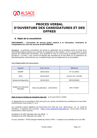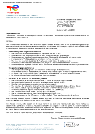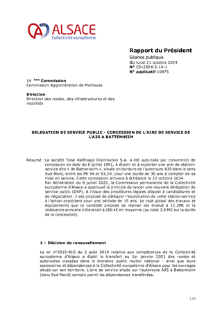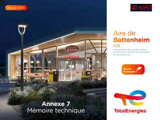 La société Total Raffinage Distribution S.A. a été autorisée par convention de concession en date du 8 juillet 1991, à établir et à exploiter une aire de station-service dite « de Battenheim », située en bordure de l’autoroute A35 dans le sens Sud-Nord, entre les PR 94 et 93,24, pour une durée de 30 ans à compter de sa mise en service. Cette concession arrivera à échéance le 22 octobre 2024. Par délibération du 8 juillet 2022, la Commission permanente de la Collectivité européenne d'Alsace a approuvé le principe de lancer une nouvelle délégation de service public (DSP). A l’issue des procédures légales d’appel à candidatures et de négociation, il est proposé de déléguer l’exploitation de cette station-service à l’actuel exploitant pour une période de 15 ans. Le coût global des travaux et équipements que ce candidat propose de réaliser est évalué à 12,2M€ et la redevance annuelle s’élèverait à 260 k€ en moyenne (au total 3,9 M€ sur la durée de la concession).