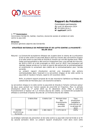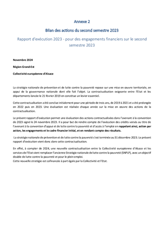 La Collectivité européenne d'Alsace est investie dans le champ de la prévention et de la lutte contre la pauvreté depuis 2019 au travers des conventions d'appui à la lutte contre la pauvreté et d'accès à l'emploi qui ont été signées avec l'Etat. Cette contractualisation a été conclue initialement pour une période de trois ans, de 2019 à 2021 et a été prolongée en 2022 puis en 2023. Une évaluation est réalisée chaque année sur la mise en œuvre des actions de la contractualisation et conditionne le versement des crédits de la contractualisation pour l’année suivante. Le présent rapport d’exécution permet une évaluation des actions contractualisées dans l’avenant à la convention d'appui et de lutte contre la pauvreté et l'accès à l'emploi, signé le 24 novembre 2023. Enfin, le présent rapport propose de ne pas reconduire l'adhésion au Réseau des collectivités territoriales pour une économie solidaire.