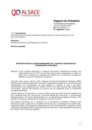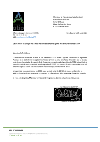 Il est proposé d'attribuer à l'Agence Territoriale d'Ingénierie Publique une indemnisation de 23 727 € au titre des coûts qu’elle a supportés, en 2024, en raison de la situation de maladie d’un agent de la Collectivité européenne d’Alsace lors de son intégration à l’agence.