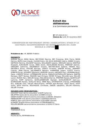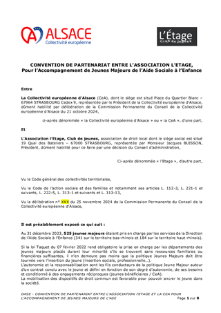 Les objectifs généraux de la politique de la Collectivité européenne d'Alsace en faveur des jeunes majeurs sortants de l’Aide Sociale à l’Enfance, visent à accompagner ces derniers, en évitant les sorties sèches mais en proposant des modes de prise en charge distincts de ceux dédiés aux mineurs. L’Association l’Etage accueille et accompagne des jeunes majeurs sur orientation des services de la Collectivité européenne d’Alsace. Il est proposé à la Commission Permanente d’approuver la convention de partenariat qui lie la collectivité à l’association pour la période du 1er janvier 2024 et jusqu’au 31 décembre 2024. Le budget dédié à cet accompagnement est de 184 000 €.