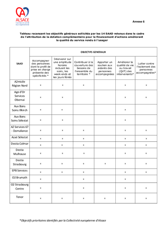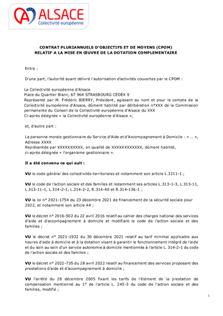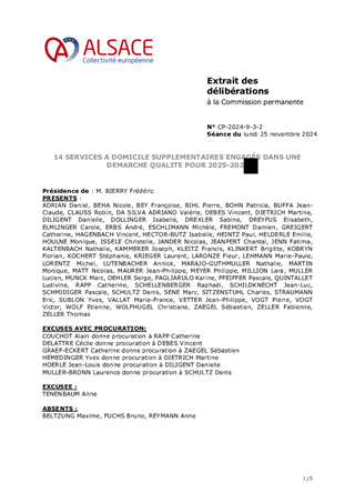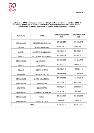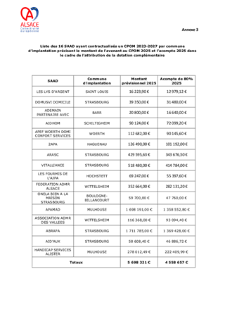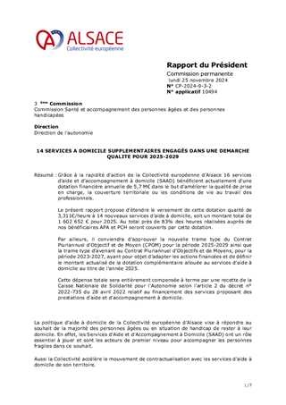 Grâce à la rapidité d'action de la Collectivité européenne d’Alsace 16 services d’aide et d’accompagnement à domicile (SAAD) bénéficient actuellement d'une dotation financière annuelle de 5,7 M€ dans le but d’améliorer la qualité de prise en charge, la couverture territoriale ou les conditions de vie au travail des professionnels. Le présent rapport propose d'étendre le versement de cette dotation qualité de 3,311€/heure à 14 nouveaux services d’aide à domicile, soit un montant total de 1 602 652 € pour 2025. Au total près de 83% des heures réalisées auprès de nos bénéficiaires APA et PCH seront couverts par cette dotation. Par ailleurs, il conviendra d’approuver la nouvelle trame type du Contrat Pluriannuel d'Objectif et de Moyen (CPOM) pour la période 2025-2029 ainsi que la trame type d’avenant au Contrat Pluriannuel d’Objectifs et de Moyens, pour la période 2023-2027, ayant pour objet d’adapter les actions financées et de définir le montant actualisé de la dotation complémentaire allouée au services d’aide à domicile au titre de l’année 2025. Cette dépense totale sera entièrement compensée à terme par une recette de la Caisse Nationale de Solidarité pour l'Autonomie selon l'article 2 du décret n° 2022-735 du 28 avril 2022 relatif au financement des services proposant des prestations d'aide et d'accompagnement à domicile.